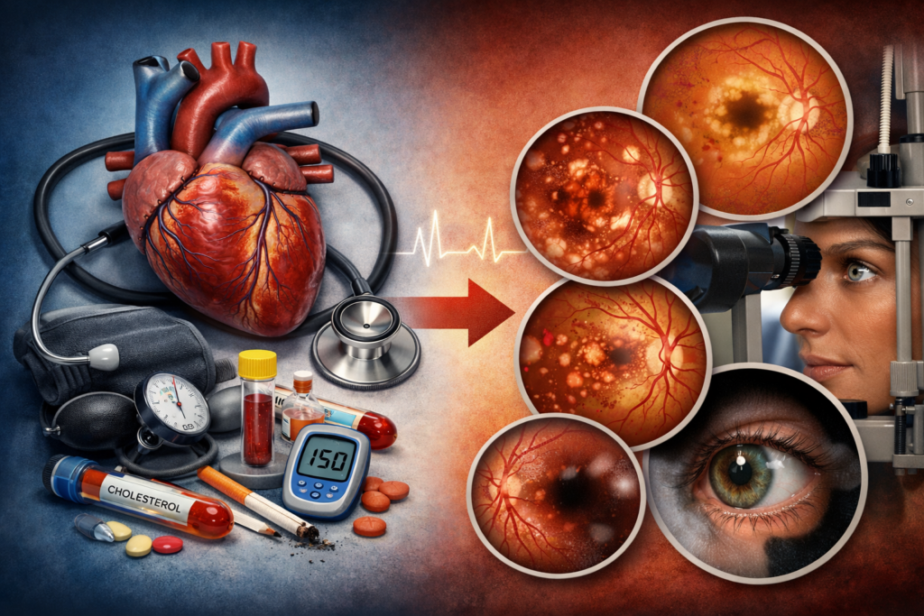 W grupie osób bez wyjściowej choroby serca i bez chorób oczu, po ok. 6 latach obserwacji osoby z wysokim ryzykiem sercowo-naczyniowym były: 6,2 razy częściej diagnozowane ze zwyrodnieniem plamki żółtej związanym z wiekiem/AMD, 5,9 raz z retinopatią cukrzycową, 4,5 razy z retinopatią nadciśnieniową, 3,4 razy z zakrzepem żyły siatkówki i 2,3 razy z jaskrą.