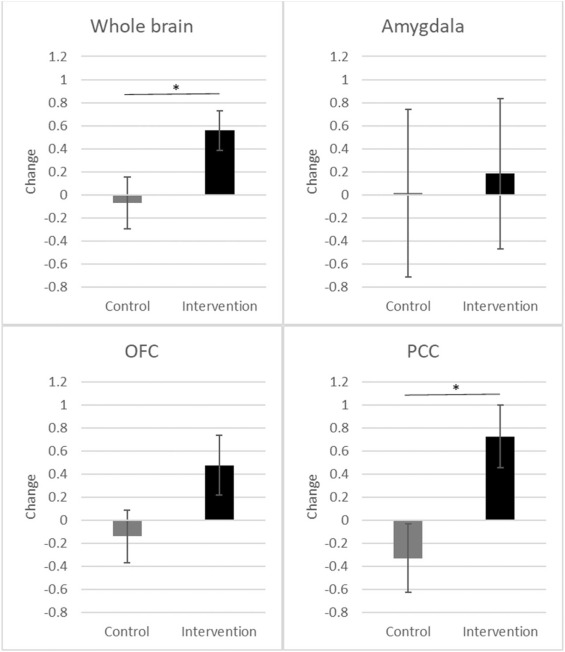 • Zmiana PCC (posterior cingulate cortex): +0,725 vs −0,330 (p=0,012; d=0,494) • Brak istotnych zmian: ciało migdałowate i OFC
