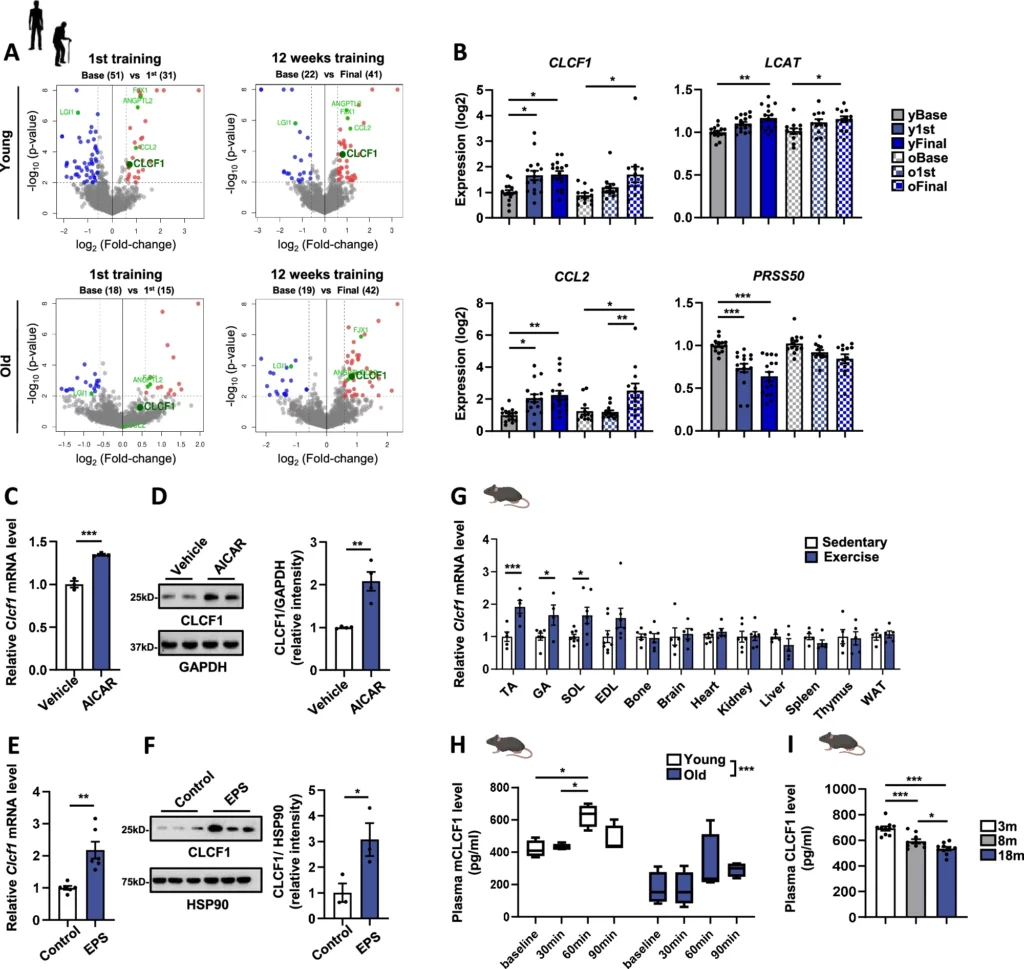 Co wyszło: CLCF1 spada z wiekiem, rośnie po wysiłku (szczególnie oporowym/HIIT), a u starych myszy „odtworzenie” CLCF1 poprawia parametry mięśni i kości; blokada CLCF1 gasi część benefitów treningu.