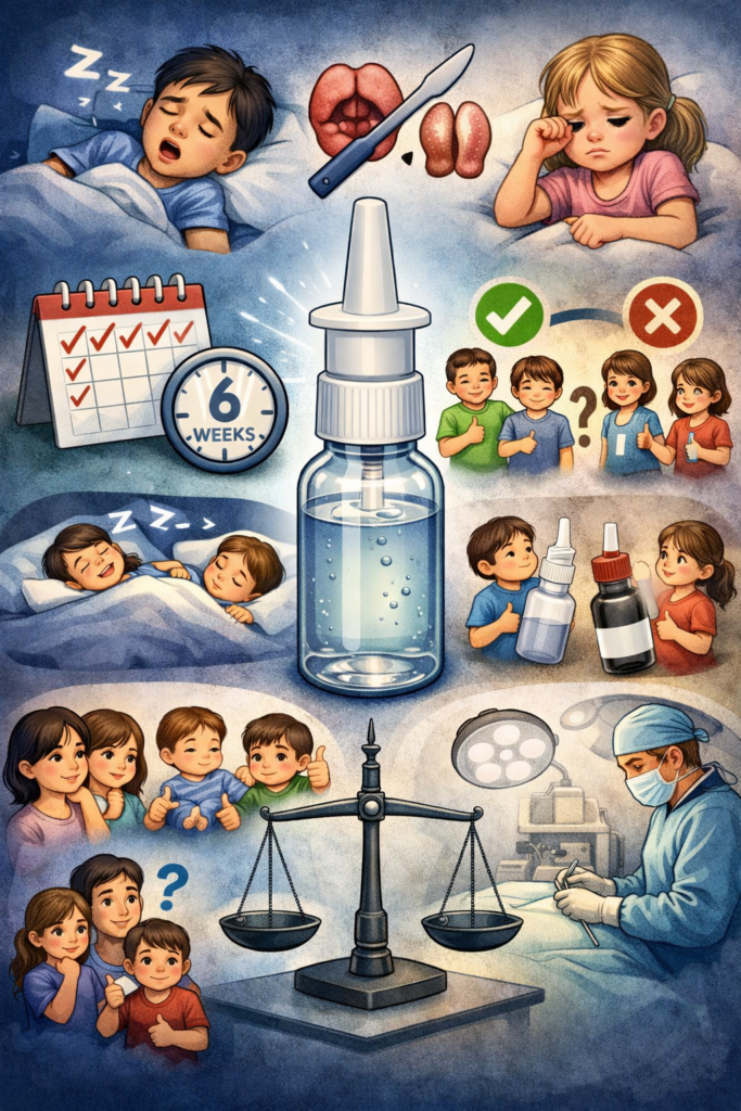 Przy dużej części dzieci z podejrzeniem obturacyjnych zaburzeń oddychania w trakcie snu pierwszym krokiem powinna być próba „taniej i bezpiecznej medycyny”: raz dziennie spray z solą „fizjologiczną” (roztwór 0,9 proc. NaCl) do nosa przez 6 tygodni – zanim podany zostanie steryd, rozpoczęta diagnostyka specjalistyczna albo leczenie operacyjne. To realnie może odciążyć kolejki i u części rodzin odsunąć lub uniknąć adenotonsillektomii.