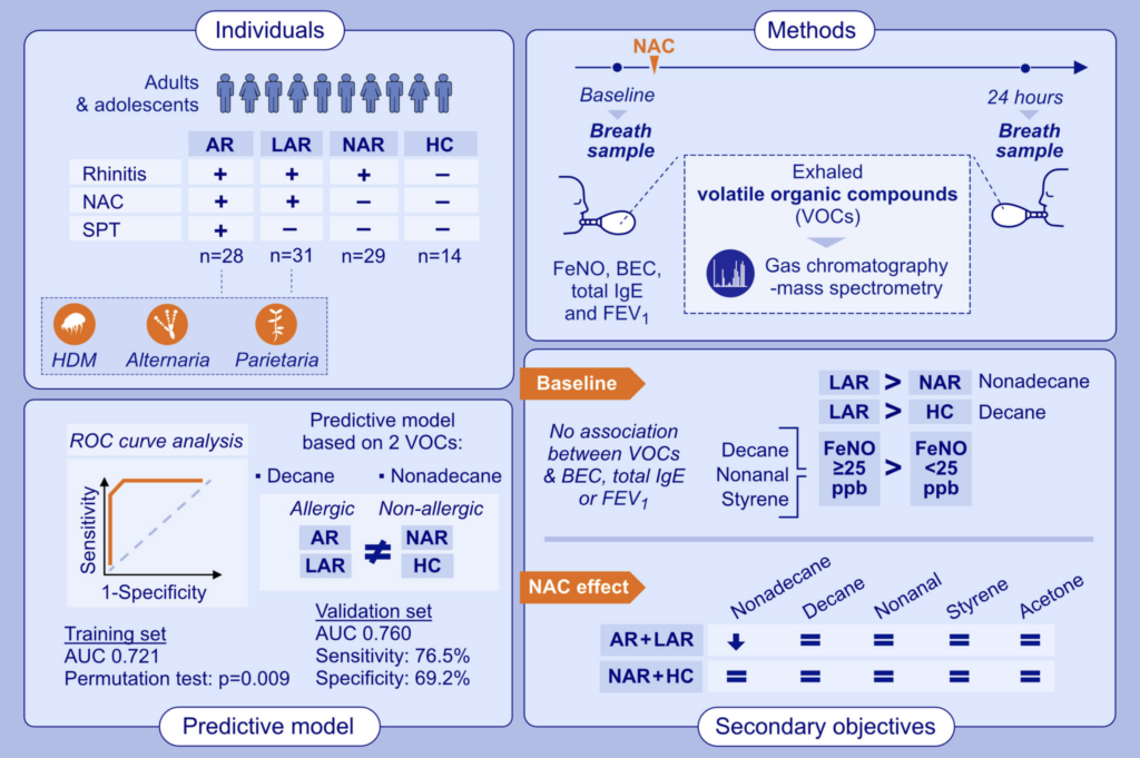 W badaniu z udziałem 102 dorosłych z przewlekłym nieżytem nosa oraz 14 zdrowych osób oceniano 5 lotnych związków organicznych w wydychanym powietrzu, przed i 24 godziny po donosowej prowokacji alergenowej.