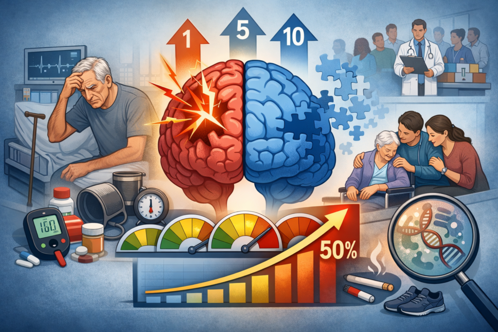 Ważne zastrzeżenie: to na razie narzędzie badawcze (dobór do kohort/biomarkerów/prób klinicznych), nie „wyrok” dla pojedynczej osoby. Ale kierunek jest jasny: opieka poudarowa ma dotyczyć nie tylko „kolejnego udaru”, ale też funkcji poznawczych. A niezależnie od score – agresywna redukcja ryzyka naczyniowego (ciśnienie, glikemia, palenie, ruch) to nadal fundament.