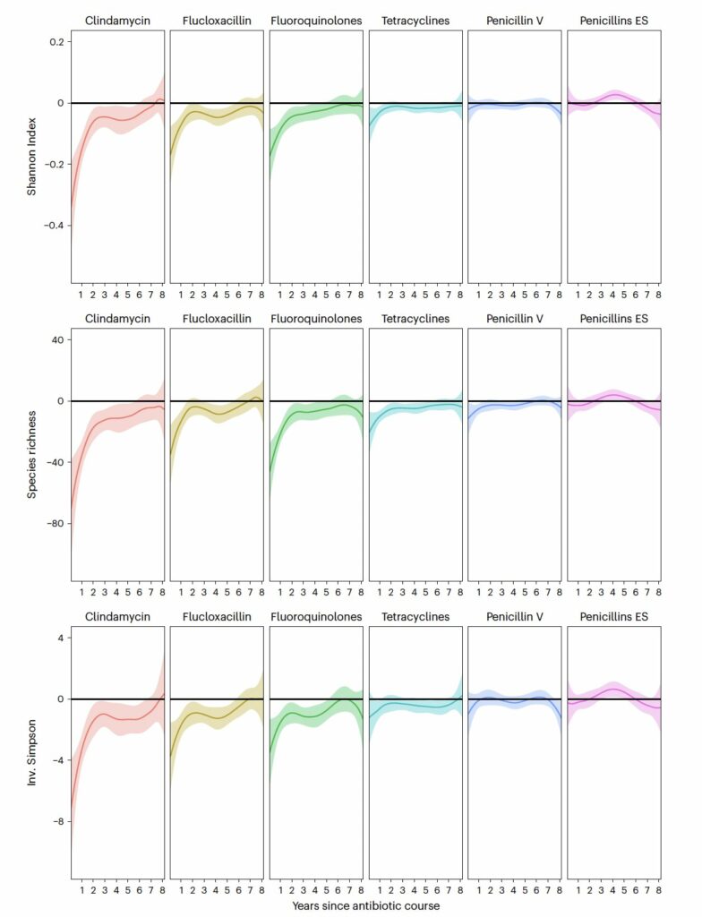 • Największy spadek różnorodności gatunkowej obserwowano po antybiotykach stosowanych <1 roku przed badaniem, ale istotne związki były widoczne także 1–4 lata i 4–8 lat wcześniej.