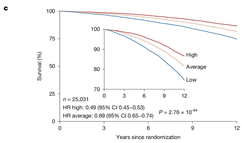 • Śmiertelność sercowo-naczyniowa była również niższa: 2,9% vs 7,5% w 12 lat (HR 0,37). Podobny kierunek zależności potwierdzono w niezależnej kohorcie Framingham.