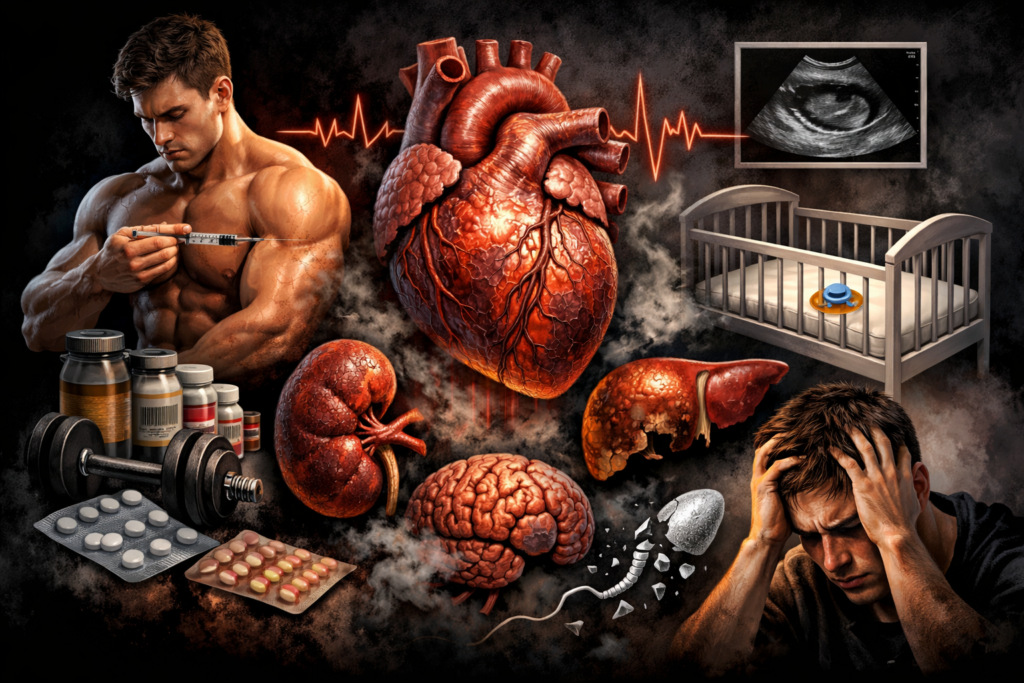 Stosowanie sterydów anabolicznych (10–50x dawki fizjologiczne) to nie poprawa formy, lecz realne ryzyko trwałych szkód wielonarządowych – szczególnie serca, problemów z płodnością oraz zaburzeń psychicznych – również u młodych osób.