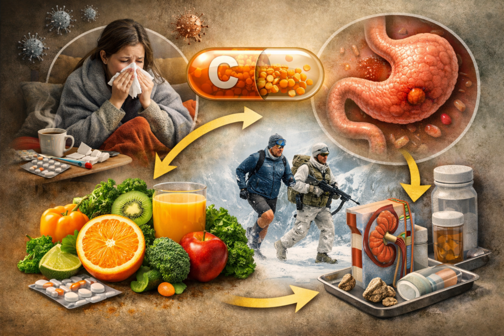 U wybranych: np. przy ekstremalnym wysiłku + stresie zimna (maratony, treningi w trudnych warunkach) albo gdy realnie grozi niedobór (m.in. palacze, część pacjentów przewlekle chorych). I ważne: „naturalne” nie znaczy „obojętne”. Duże dawki często kończą się problemami z przewodem pokarmowym, a u niektórych ryzyko działań niepożądanych rośnie.